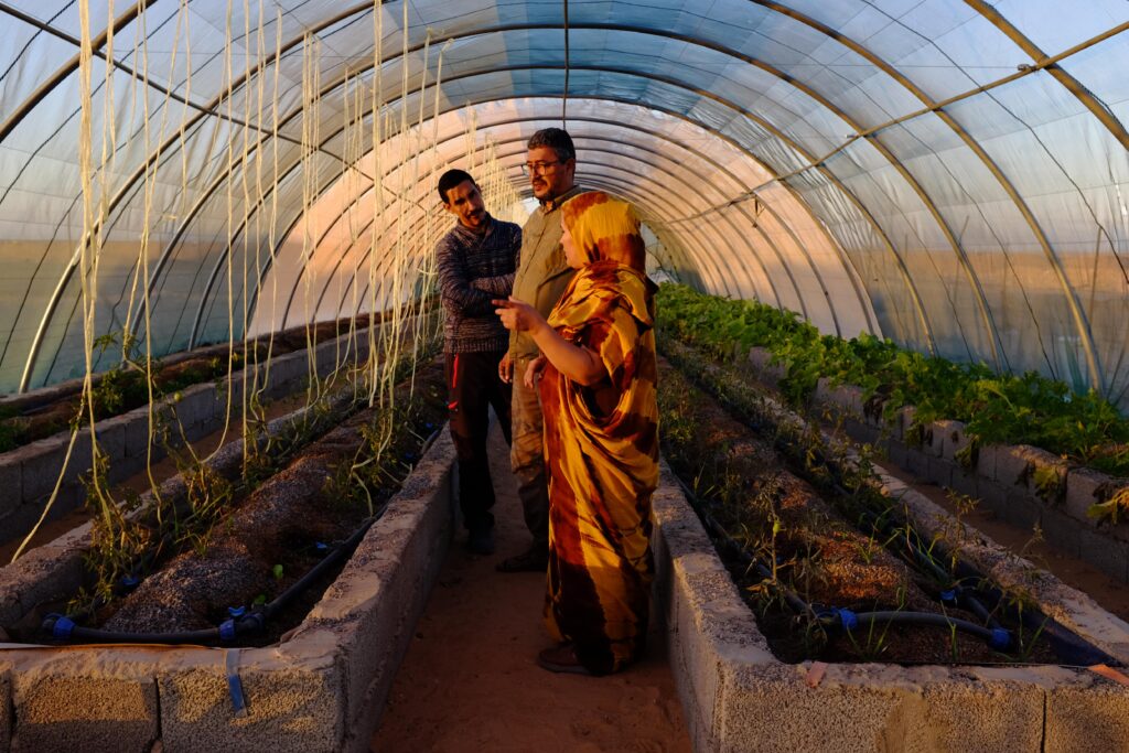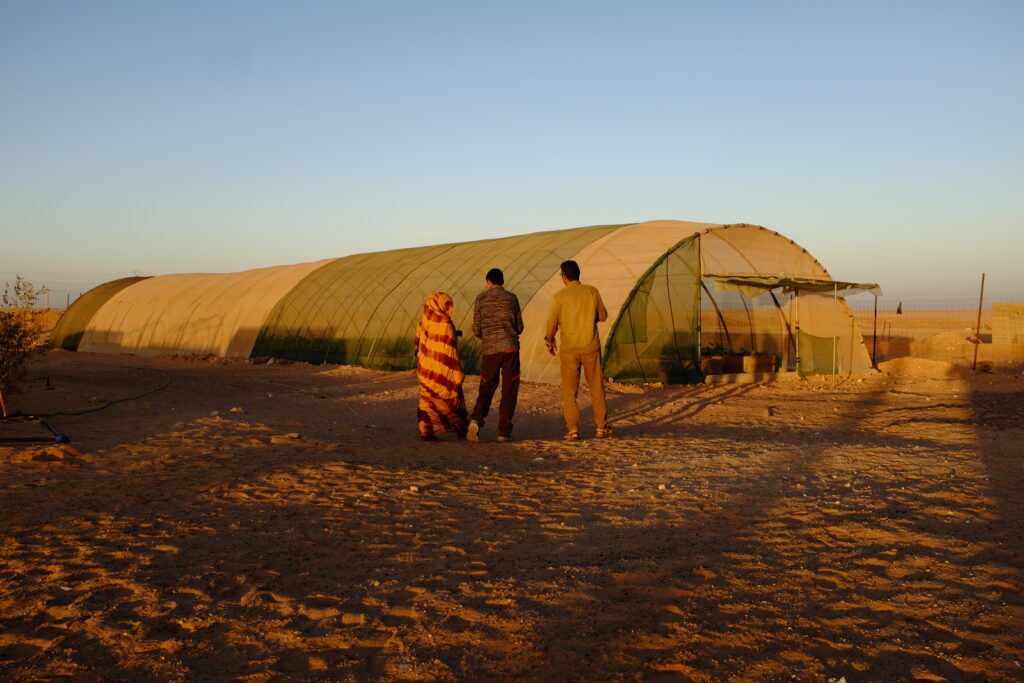 Fatima sitzt auf einem Tuch am Rand der Sandäcker. Neben ihr giesst ihr Fahrer Grüntee von einem Glas ins andere. Für Fatima ist Hoffnung ein Verb: «Hoffen ist kein Gefühl, sondern heisst, mein Bestes zu geben.» Die Ergebnisse ihres Hoffens spriessen aus dem Boden: Kürbisse gedeihen auf offenem Feld. Hier und in zwei Gewächshäusern verwandelt Ziegenkot den Sand in Nährboden, auf dem Melonen, Paprika und Auberginen wachsen. Ein Wall aus 5000 Bambuspflanzen soll vor dem Wind schützen, der den Boden abträgt. Oliven- wechseln sich mit Feigenbäumen und Weinreben ab.